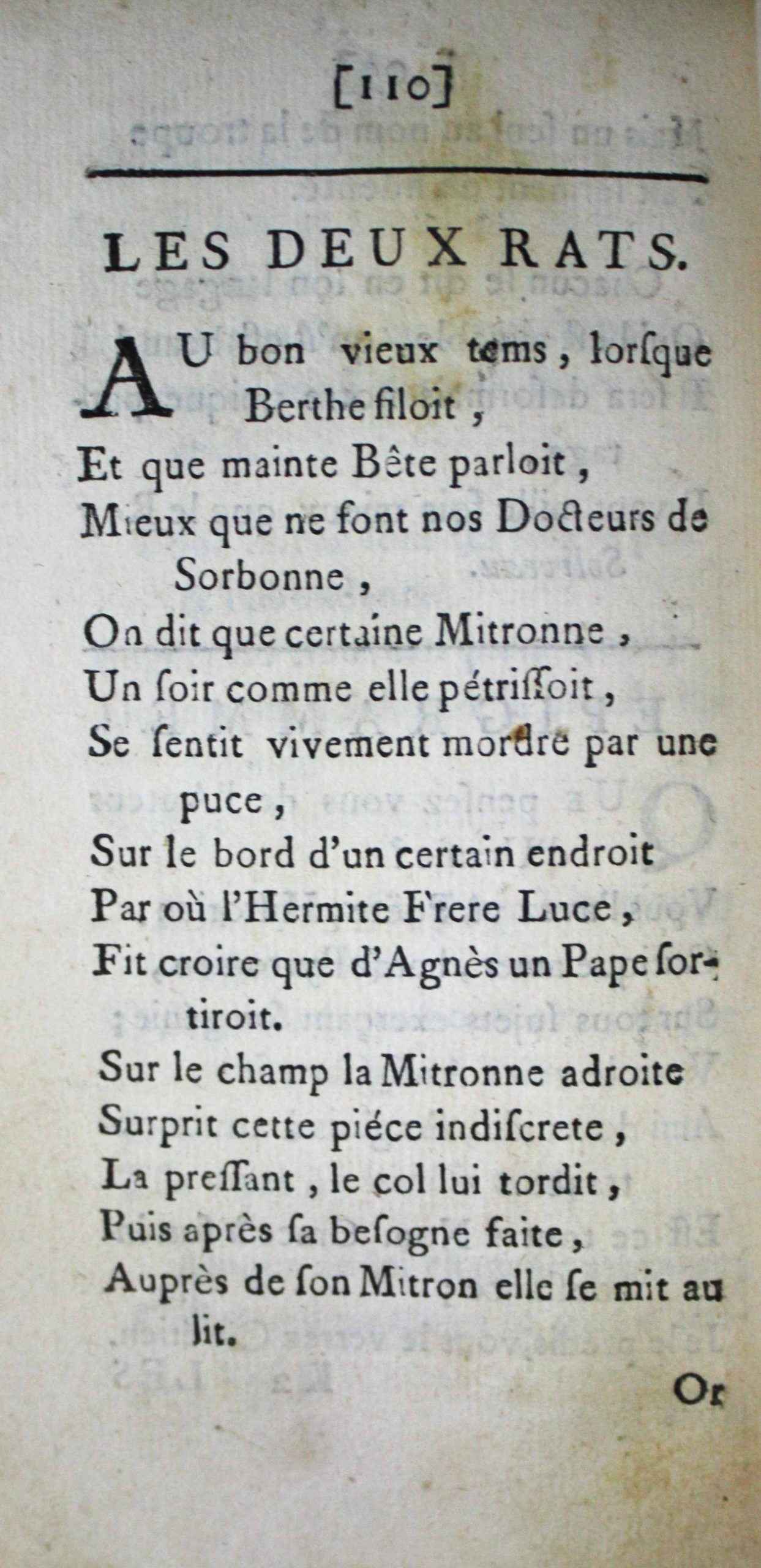 L’Etonnement [poem75-78] ; Le Poète vengé [78-83] ; L’Asne et le Rossignol [fable, 84-89] followed by l’Epilogue [90-91] ; Le nouveau roy des grenouilles ou le P. J. dans un fossé [free verse satire, 92-109] ; Epigramme [against Voltaire [?], 109]; Les Deux Rats [very licentious poem, 110-113];