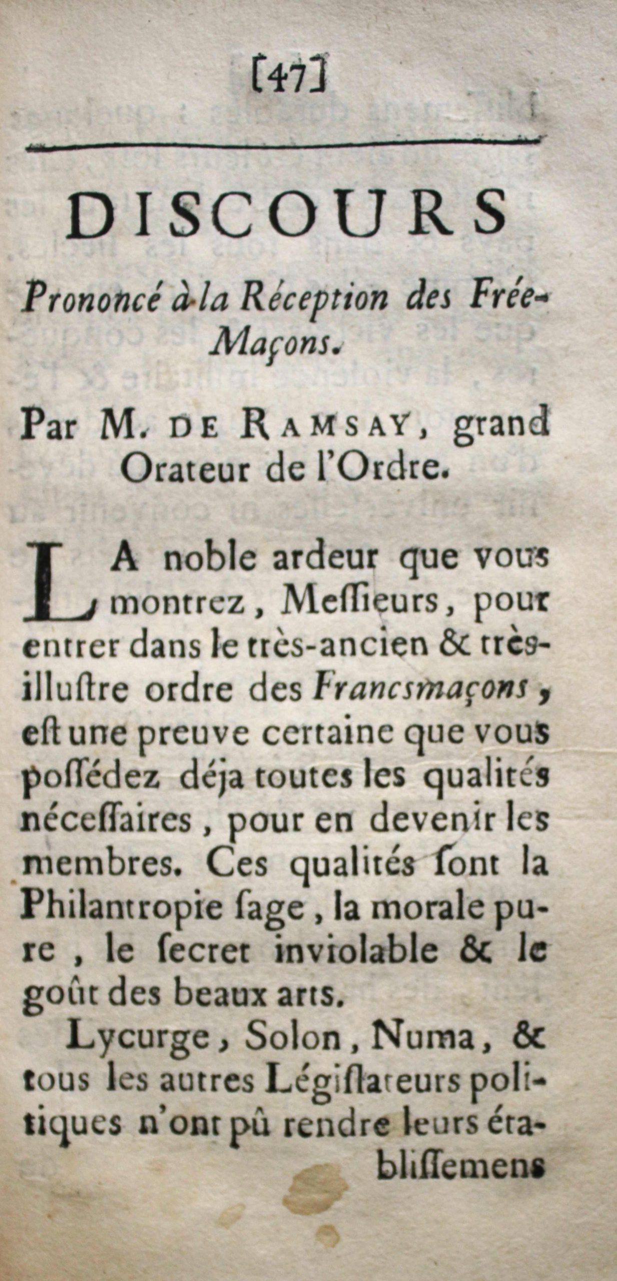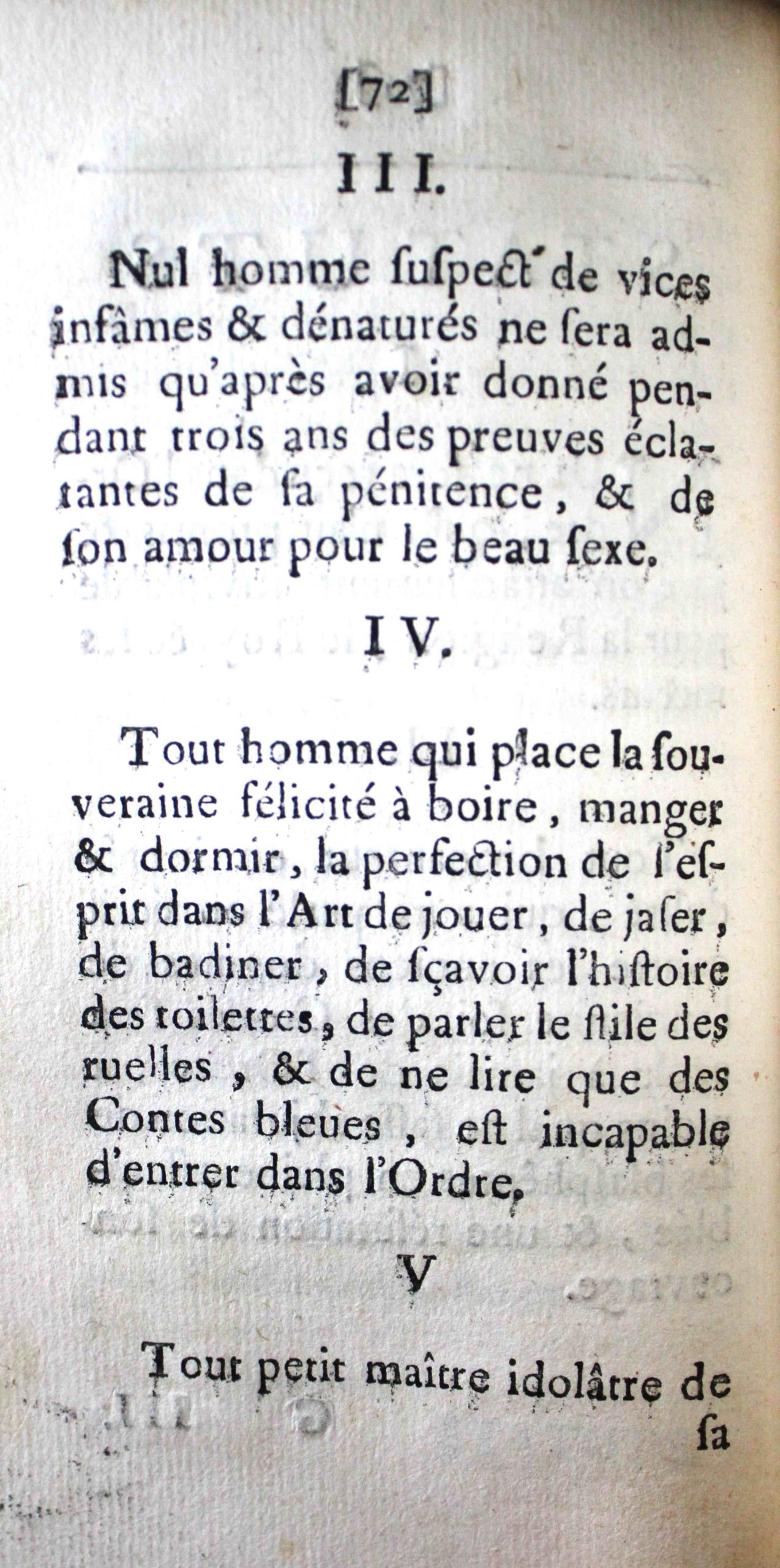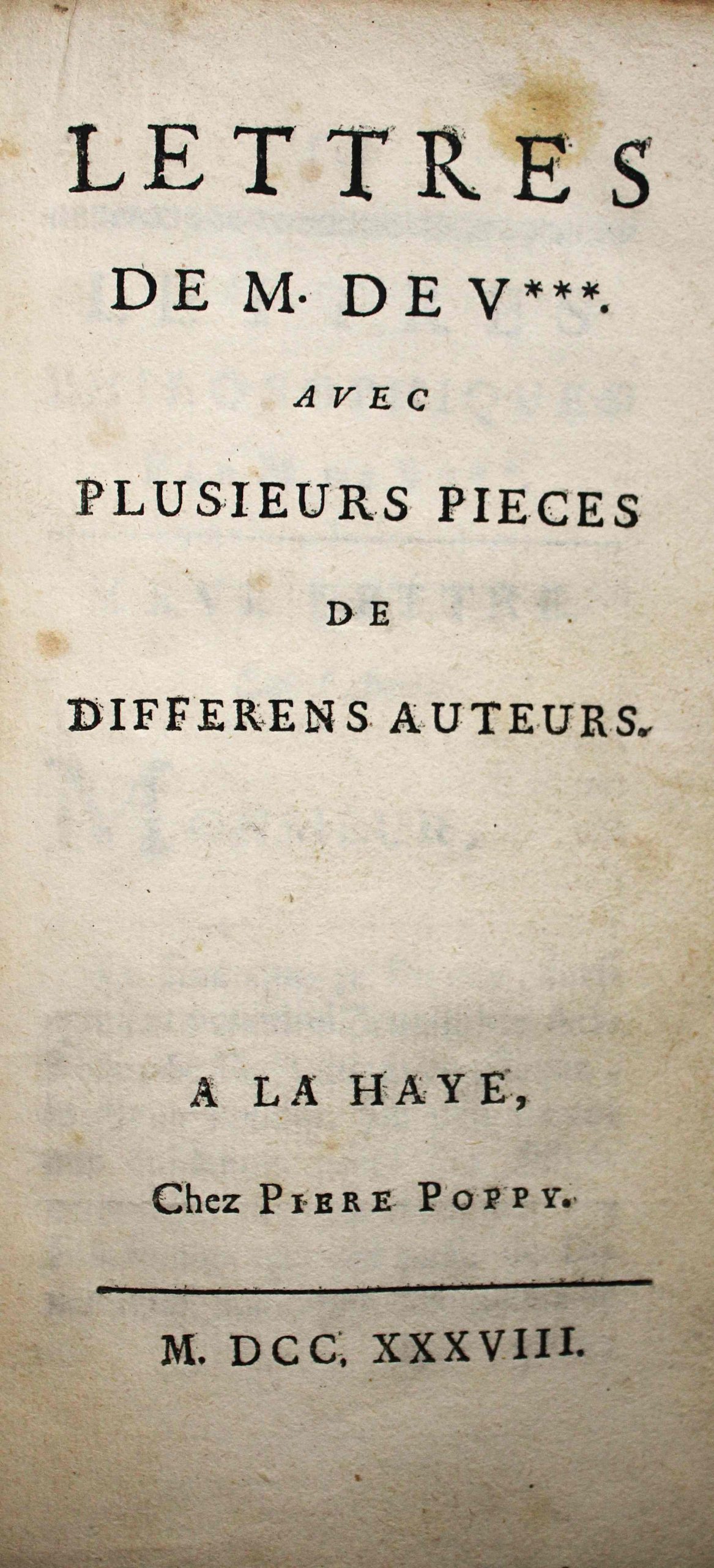 Lettres philosophiques par M. de V***. XXVI. Lettrer Sur l’Ame [pp. 1-22] ; Les Adieux de M. de V*** à Madame de Chastelet [poem, 23-29] ; Autre pièce [licentious satirical poem, 29-30] ; Le débauché converti par M. Robbé de Beauveset [very licentious poem, 30-41] ; Marsias, Allégorie contre Rameau par Roy, août 1737 [41-46] ; Discours prononcé à la réception des Frée-Maçons. Par M. de Ramsay, grand Orateur de l’Ordre [47-70] suivi des Statuts [satire [?] on the unisexuality of lodges, with reference to homosexuality, 71-74] ;