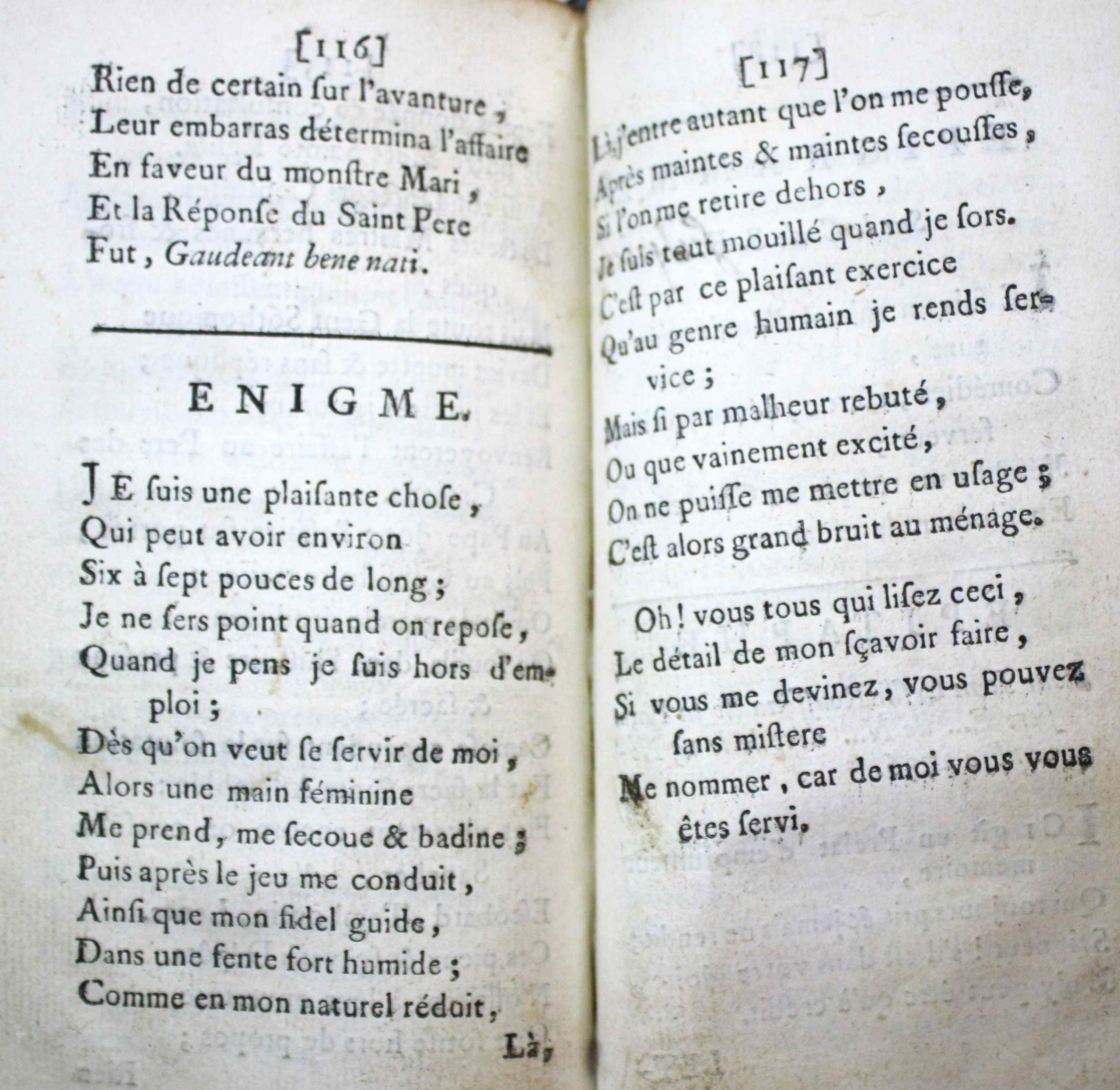 L’Ygrec ou la Fourche [idem, 113-116] ; Enigme [in verse, about the penis 116-117] ;
