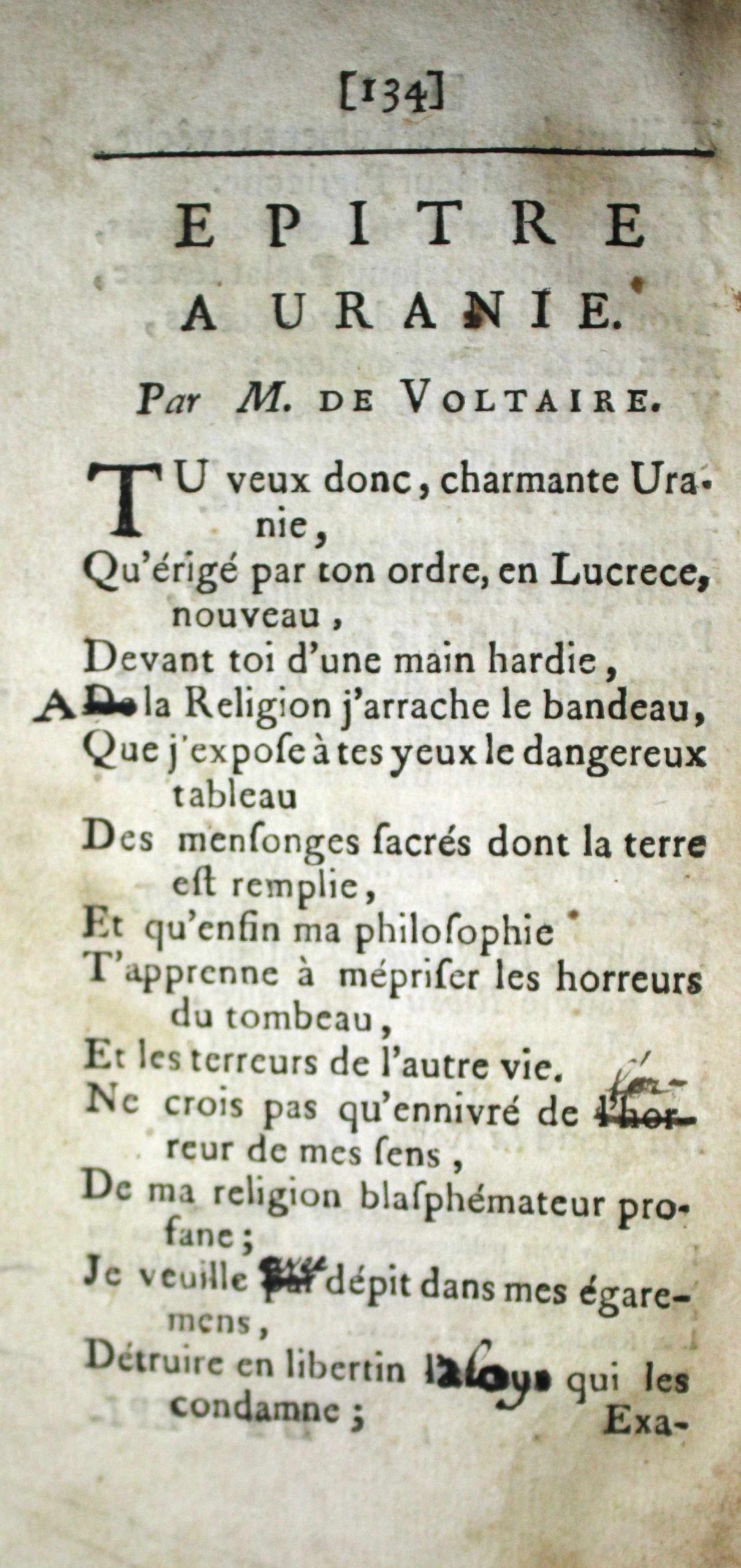 Epigramme [about the Count of Saint-Sulpice, 118] ; Epitaphe pour Jean CĂ©sar de la Parisière [118] ; Lettre de la Baronne de Roupillac Ă Madame des Etoiles […] [Voltaire’s satire [?] against de la Marre, 119-129] ; Lettre pastorale du rĂ©vĂ©rendissime Pancrasse Pellegrin, patriarche de l’OpĂ©ra […] [anticlerical satirical poem, 129-133] ; Epitre Ă Uranie par M. de Voltaire [violent anticlerical satire, 134-140] ; La Mule du pape [by Voltaire, idem, 141-142] ; Le Nez et les Pincettes, conte par Piron [licentious poem, 143-148] ; L’Anti-mondain par le mĂŞme [satirical poem, 149-153] ; L’Habit ne fait pas le moine, by the same [157-161] ; 2 poems byPiron ; La rĂ©conciliation de Rousseau avec ses ennemis [164-167] ; ApothĂ©ose de Mademoiselle Couvreur, actrice, morte le 2 mars 1730 by M. de Voltaire [167-169] ; 5 poems in the same style.