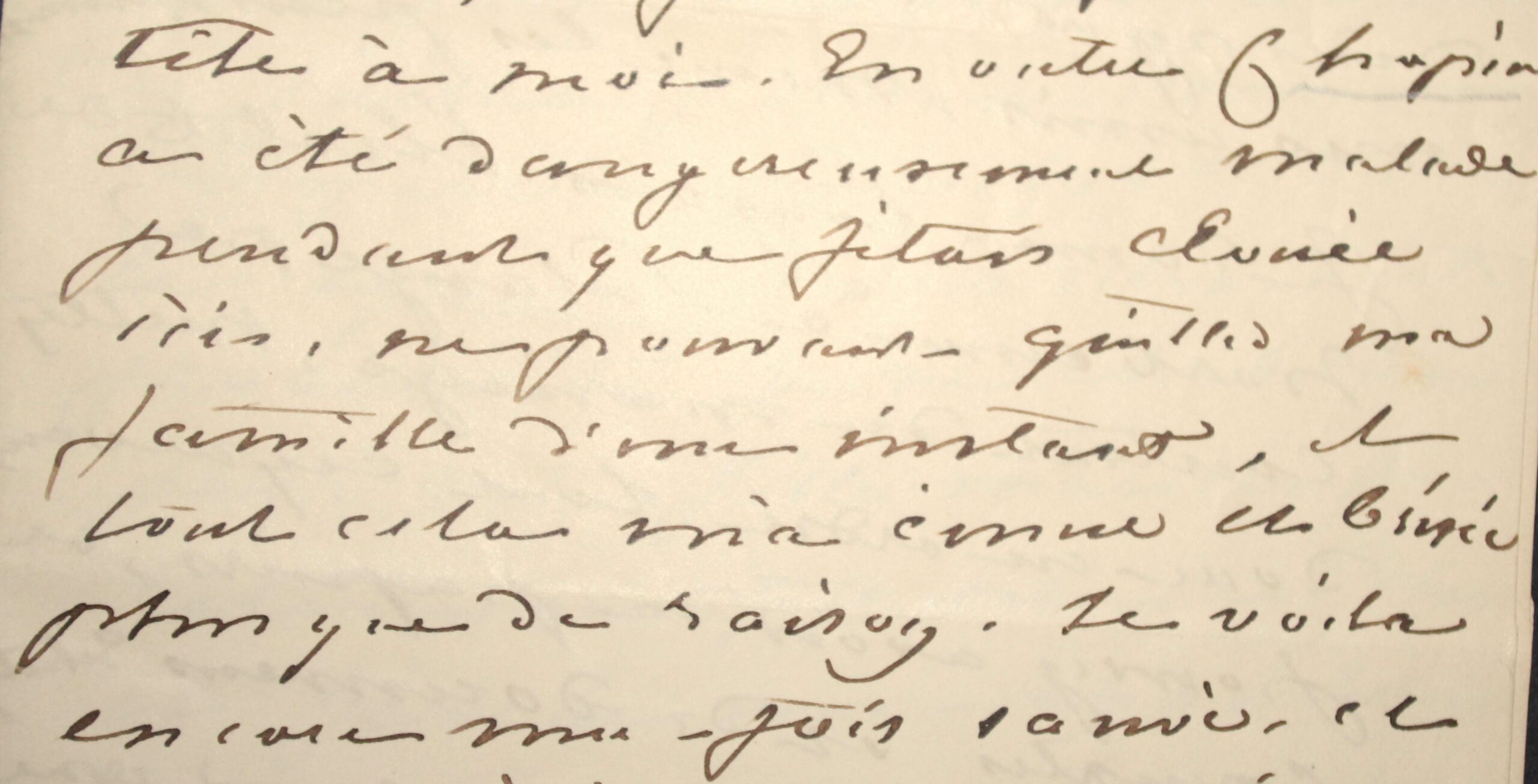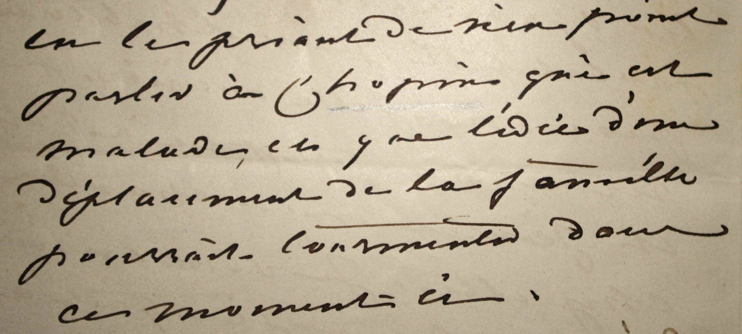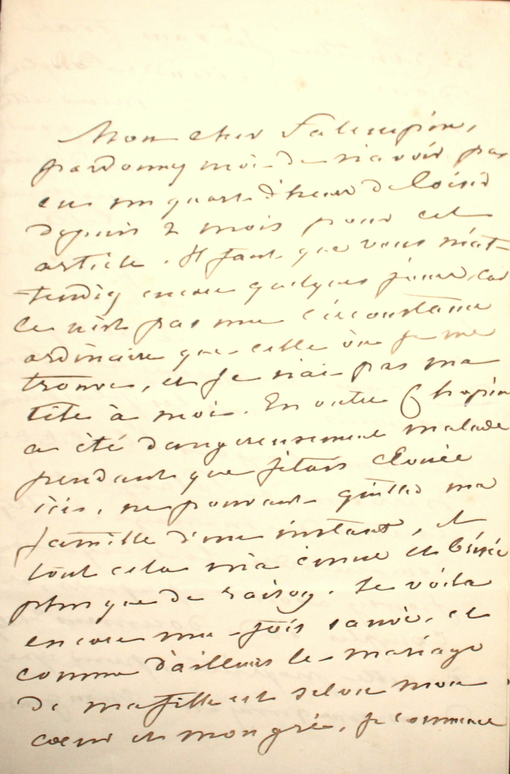 « Mon cher Falempin, pardonnez-moi de ne pas avoir eu un quart d’heure de loisir depuis 2 mois pour cet article. Il faut que vous m’attendiez encore quelques jours, car ce n’est pas une circonstance ordinaire que celle où je me trouve, et je n’ai pas ma tête à moi. En outre, Chopin a été dangereusement malade pendant que j’étais clouée ici, ne pouvant quitter ma famille d’un instant, et tout cela m’a émue et brisée plus que de raison. [Chopin avait fait une grave crise d’asthme le 2 mai]. Le voilà encore une fois sauvé, et comme d’ailleurs le mariage de ma fille est selon mon cœur et mon gré, je commence à renaître.