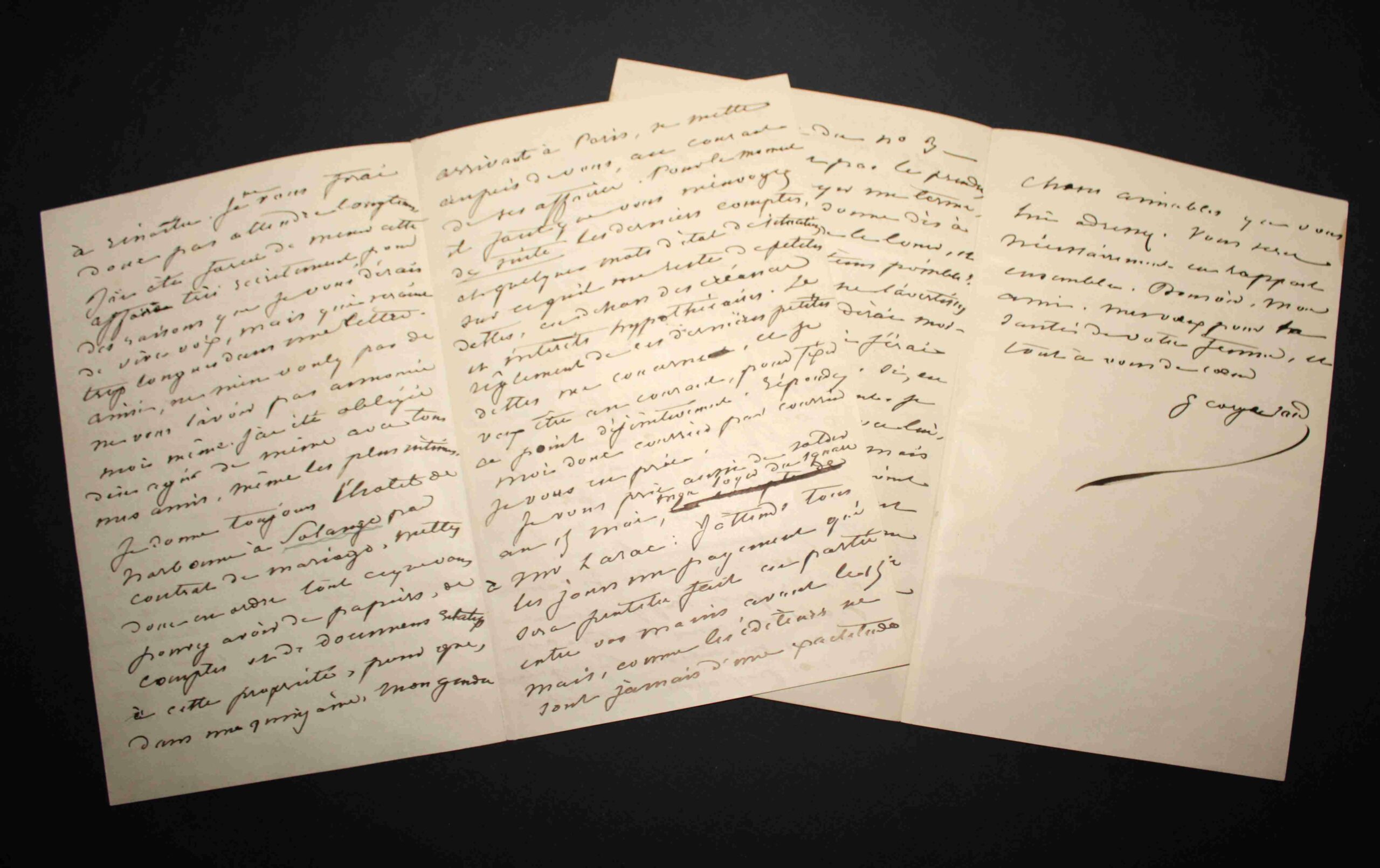 George Sand (1804-1876). Lettre autographe signée « George Sand », sans lieu ni date [Nohant, entre le 8 et le 15 mai 1847], à « Mon cher Falempin [sic] ». Gabriel Falampin (1803-1860), clerc de notaire puis avocat, fut un des fondateurs de L’Illustration, chargé de la partie artistique de ce journal, ainsi que l’homme d’affaires et avoué de George Sand, de 1841 à 1852, bien qu’elle se soit irritée de sa négligence et de sa lenteur à répondre. 7 pp. in-8° sur 2 bi-feuillet à son chiffre gaufré.