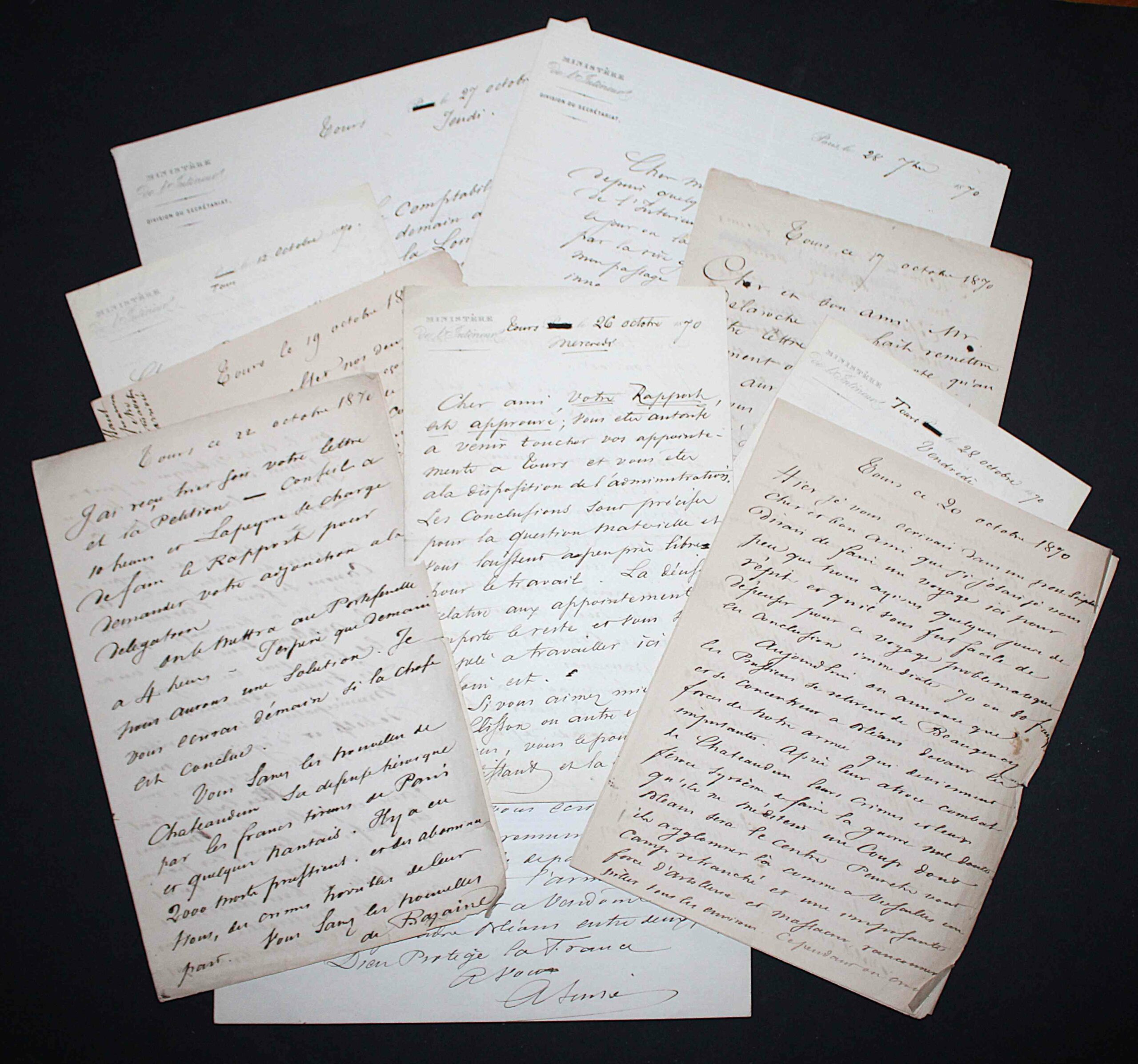 Alfred Sensier (1815-1877), marchand, critique et historien de l’art, attaché à la Direction des Beaux-arts ; il est alors membre du cabinet du ministre de l’Intérieur. 10 lettres autographes signées, adressées à Jules Niel (1800-1872), alors Bibliothécaire du ministère de l’Intérieur. Tours, 28 septembre – 28 octobre 1870. 32 pp. in-8° et in-4° (quelques fentes aux pliures).